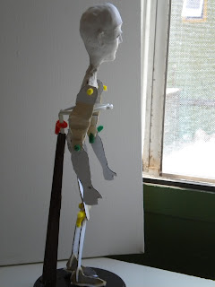 I've attached each section with pipecleaners to see if the connecting points will give him full range of motion. Basically to see if he looks right. His torso I saw needs to be elongated, which I needed to do anyway as his private parts aren't anything but a snip of a coffee stirrer. Maybe that's TMI, he whispered to me just now.